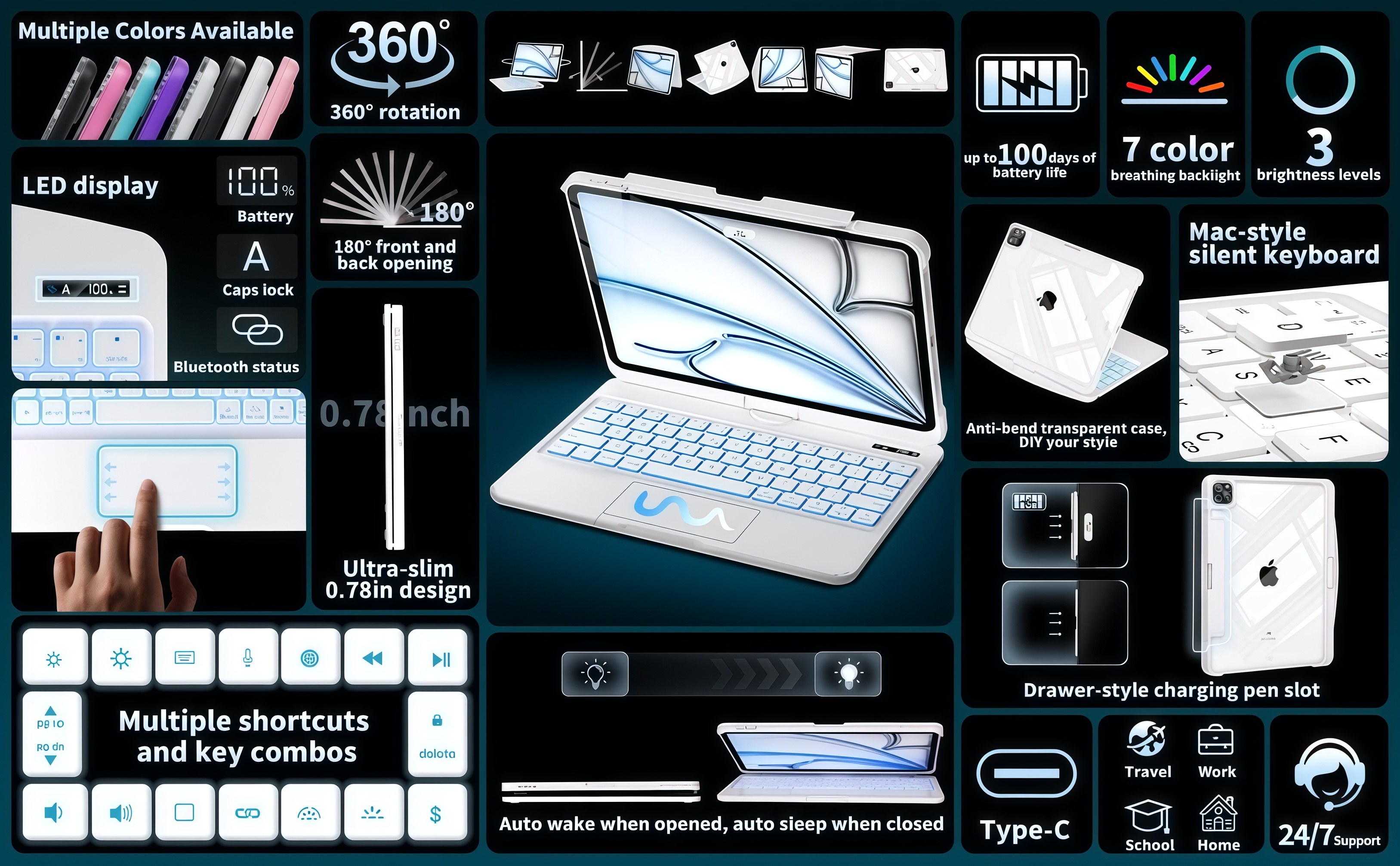 Write a review For White Backlit iPad Keyboard Case, Suitable for iPad Tablets, 7-Color Backlit,Magic Wireless Keyboard, 360°Rotating,with trackpad,Pencil Holder
